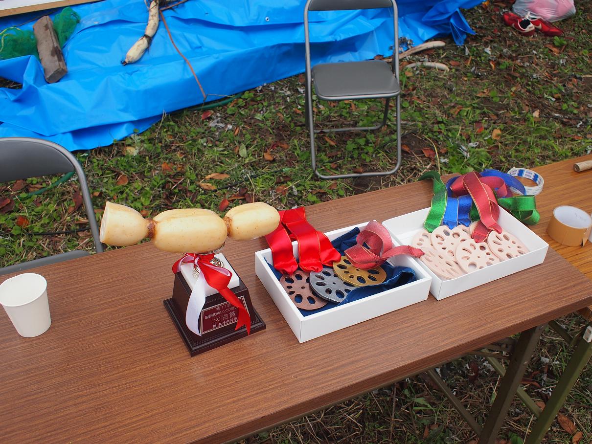 大きなレンコンを掘り上げた人に贈られるトロフィーとメダル