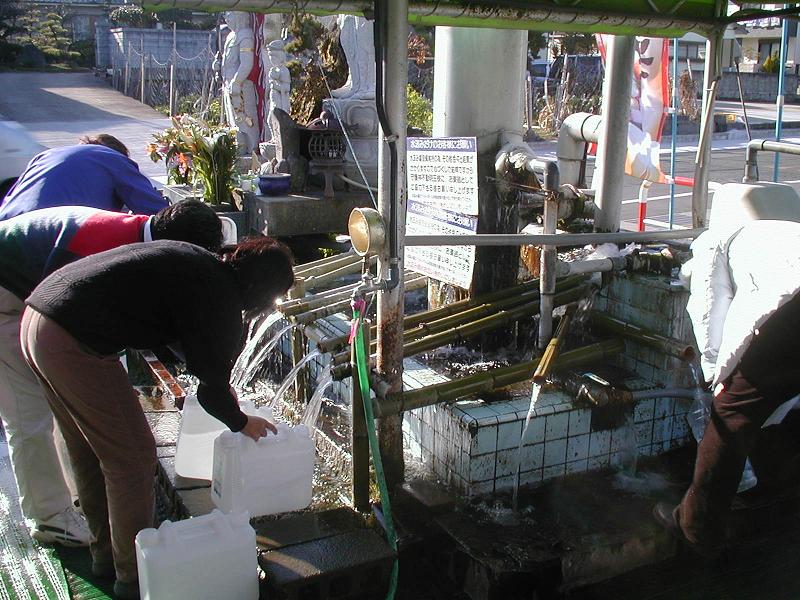 島原市内のいたるところにきれいな水が湧き出しており、毎日大勢の人がペットボトルやポリタンクを持って水をくみに来ます。たいてい水の湧き出し口には、水神様や観音様、不動明王などが祀(まつ)られています。車のトランクにたくさんのペットボトルやポリタンクを積んでくみに来る人も多く、家に水道があっても炊事には、こうしてくんで来た湧水しか使わないという家庭も少なくないそうです。長崎や福岡から休みを利用してくみに来る人もいます。