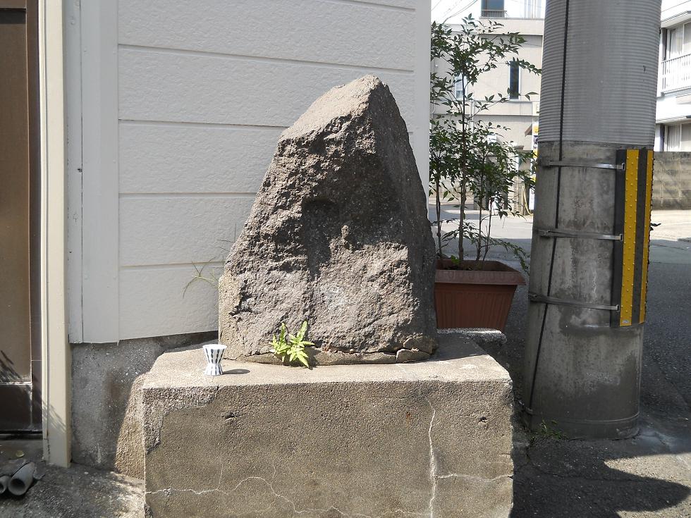しまばらで見られる猿田彦の石像のほとんどが、このような形の石に「猿田彦大明神」と彫られている。置かれている場所も家の北側の角に、東向きにまつられていることが多い。